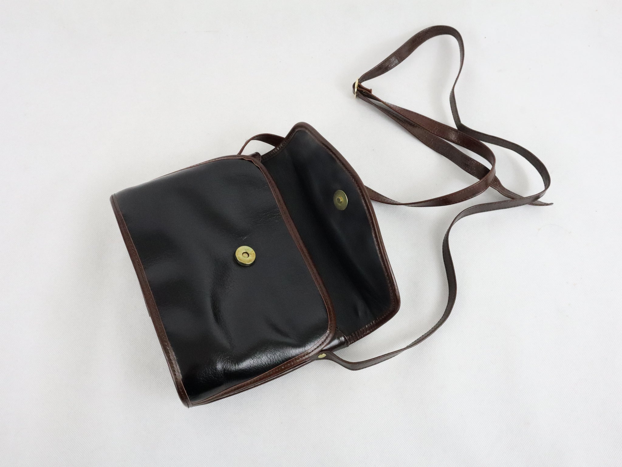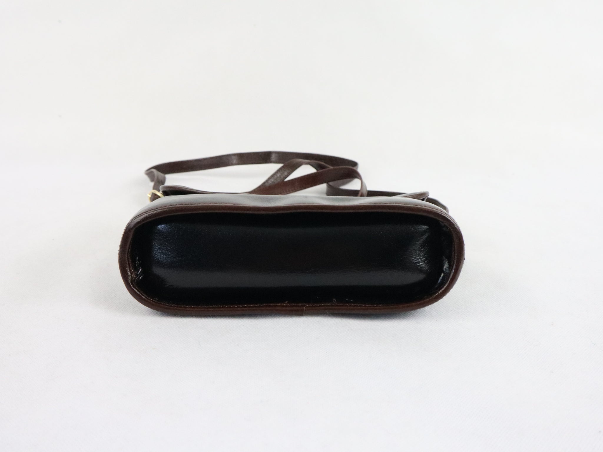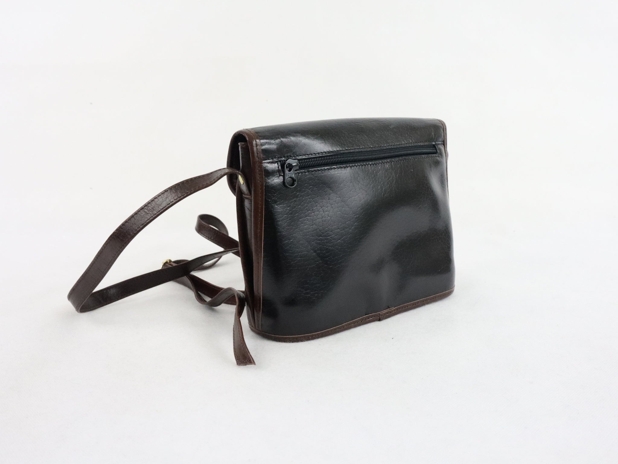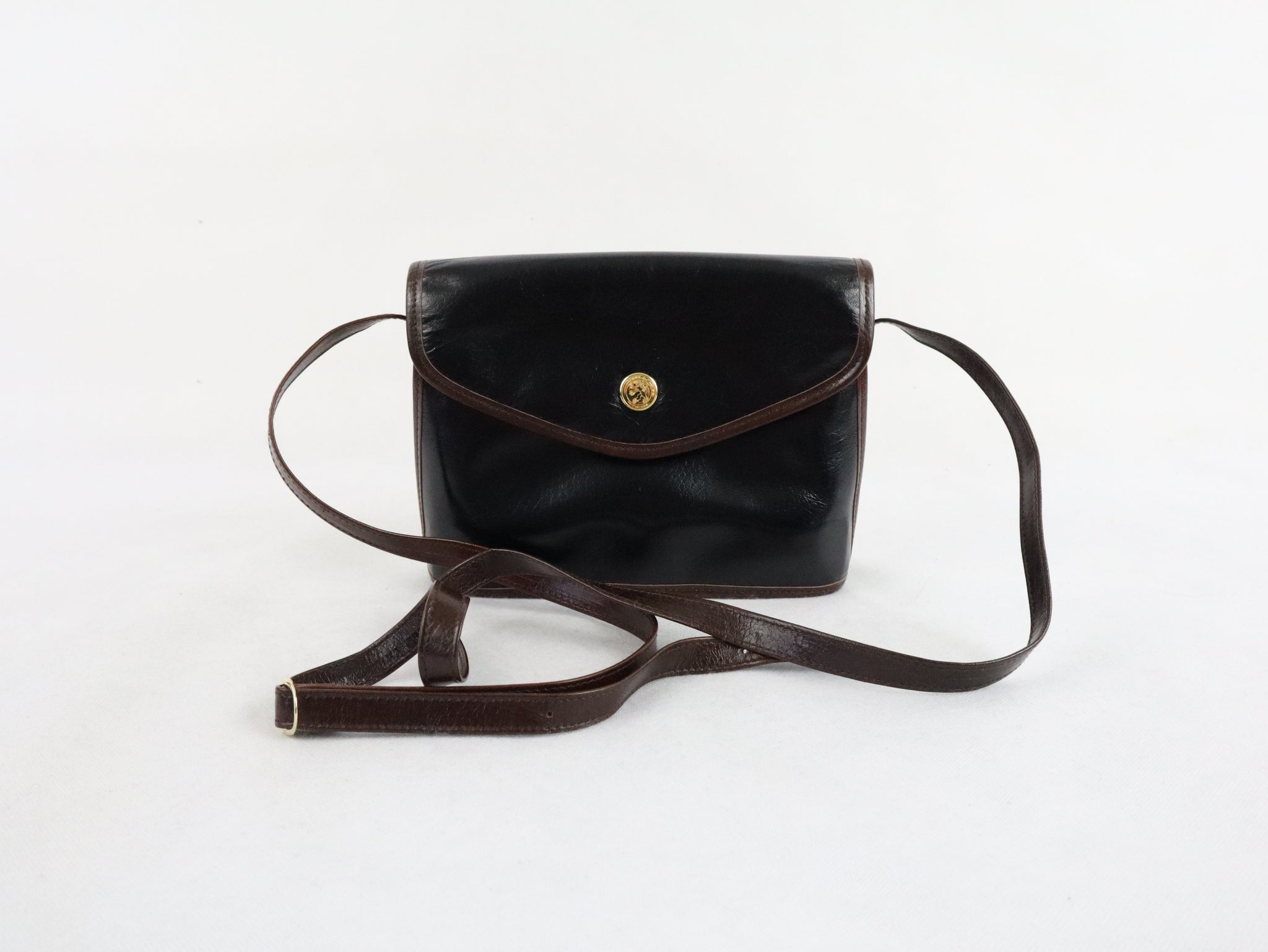 Musta olkalaukku ruskeilla reunuksilla ja olkahihnalla, valmistaja PT Design.