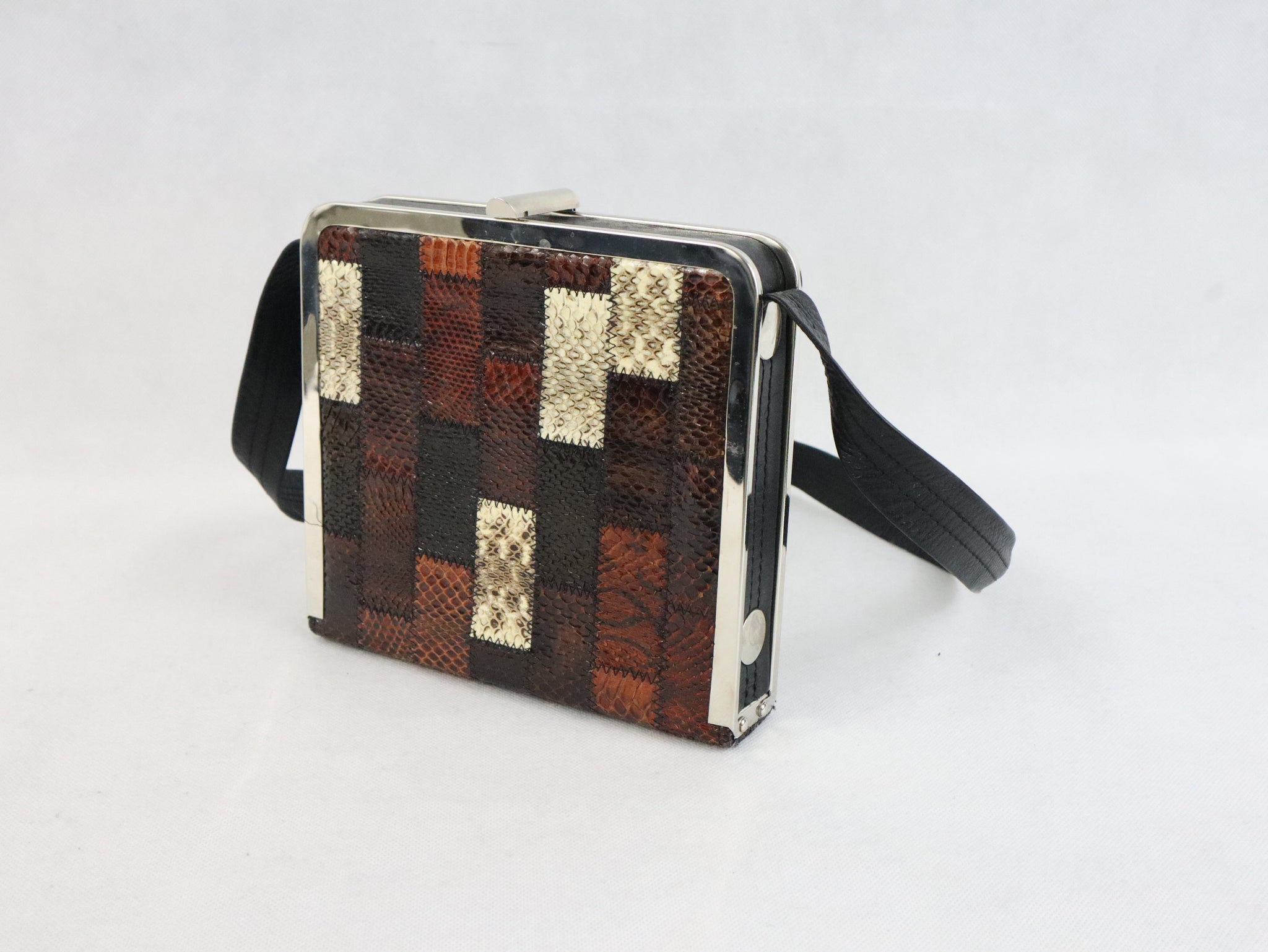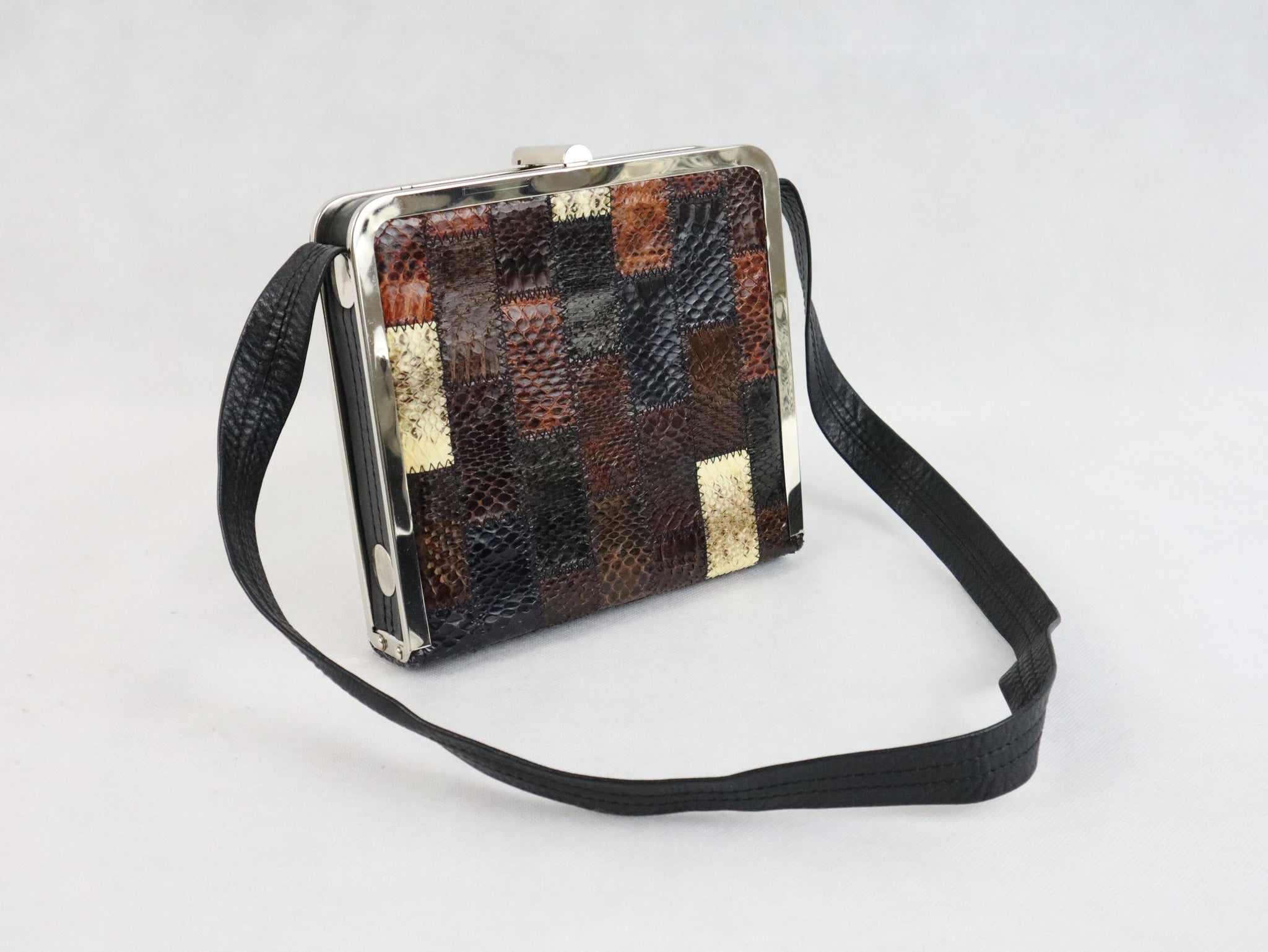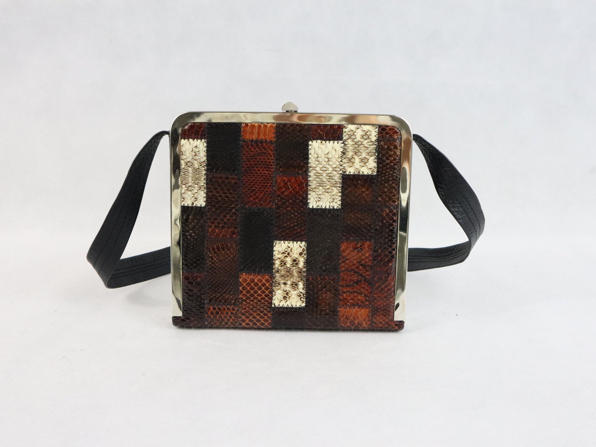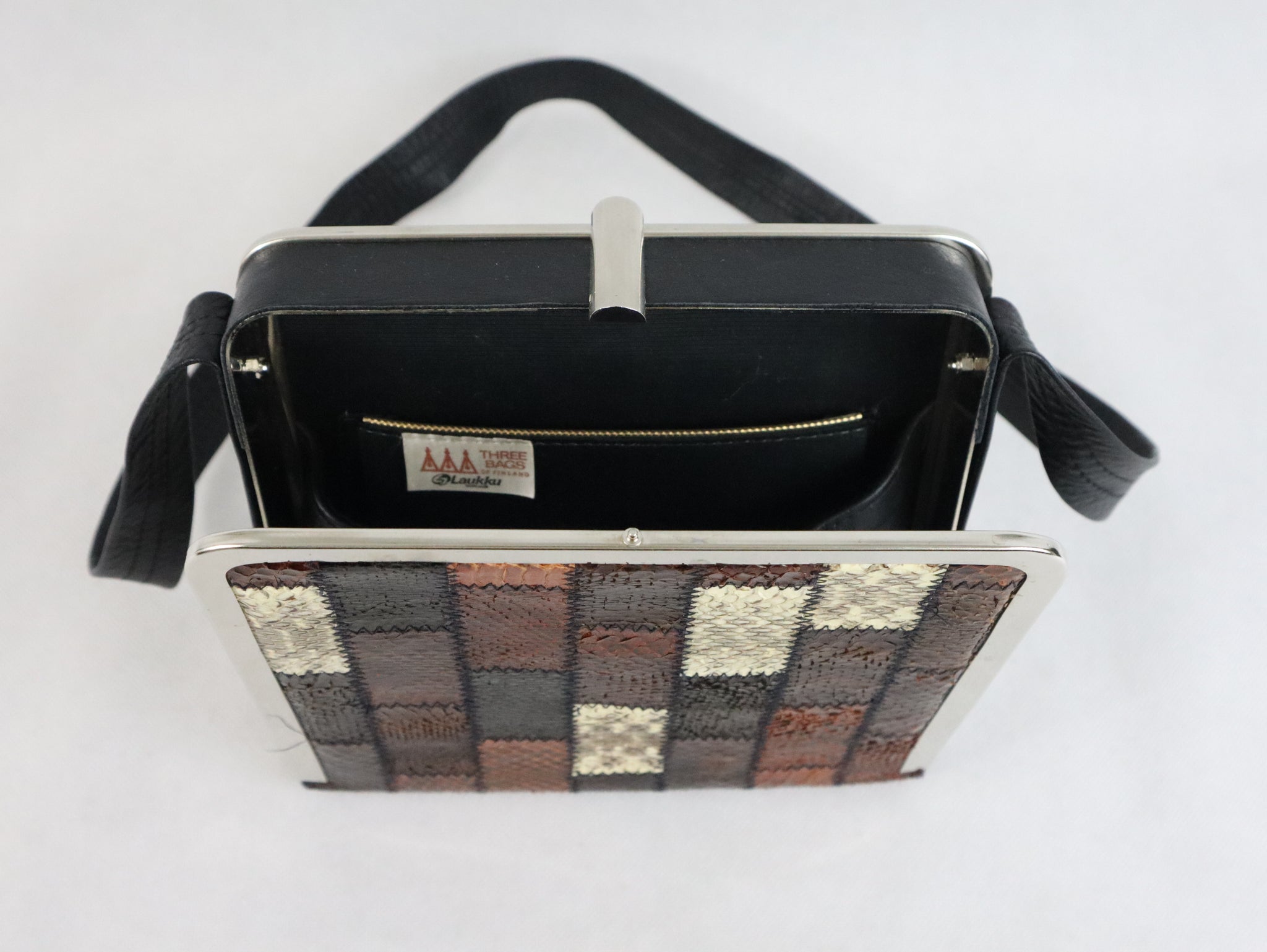 Ruskeasävyinen kotimainen 70-luvun vintage kehyslaukku, jossa on nahkapaloista sommiteltu pinta, valmistaja Three Bags of Finland, EJ-Laukku Oy, Varkaus.