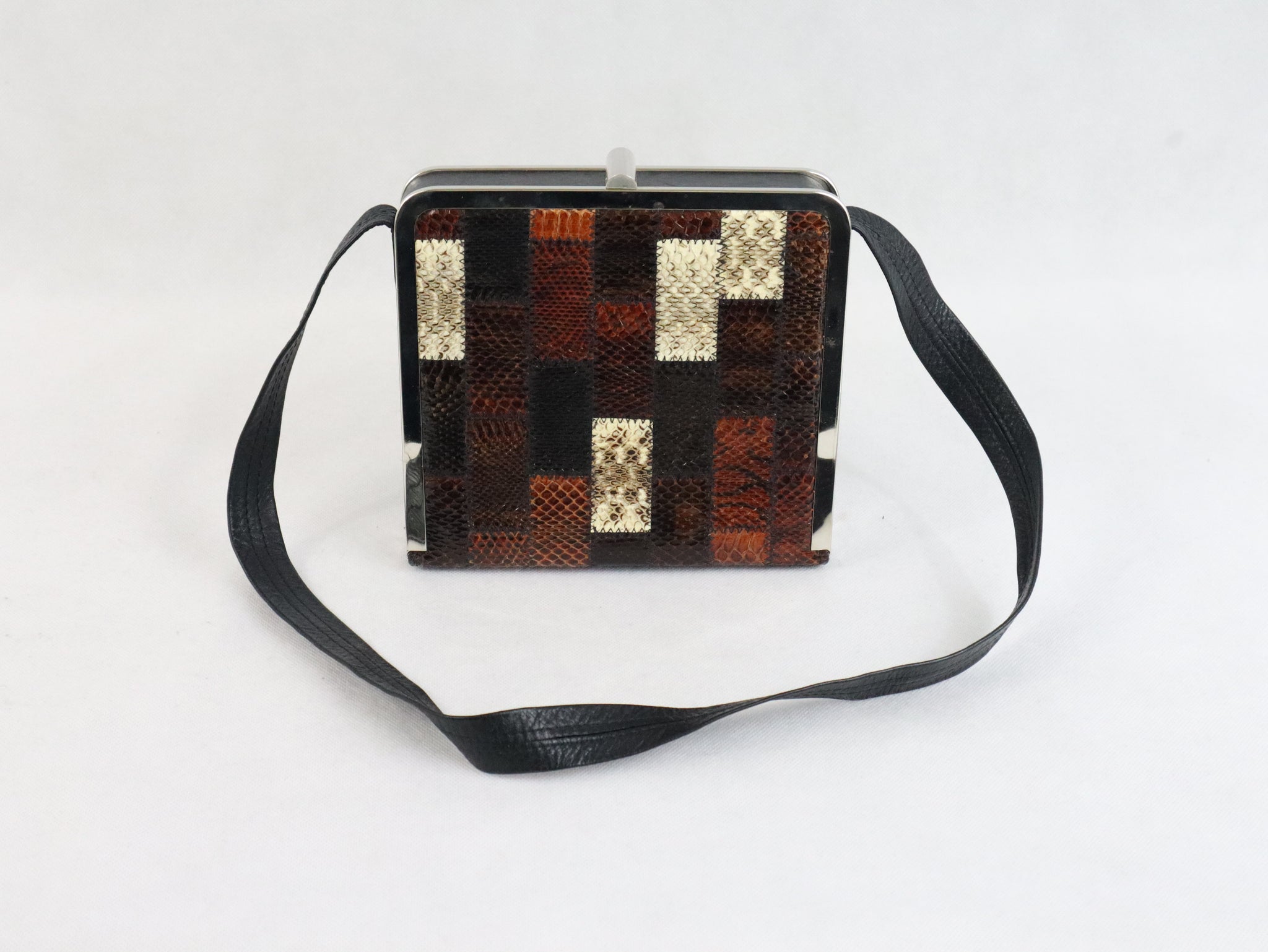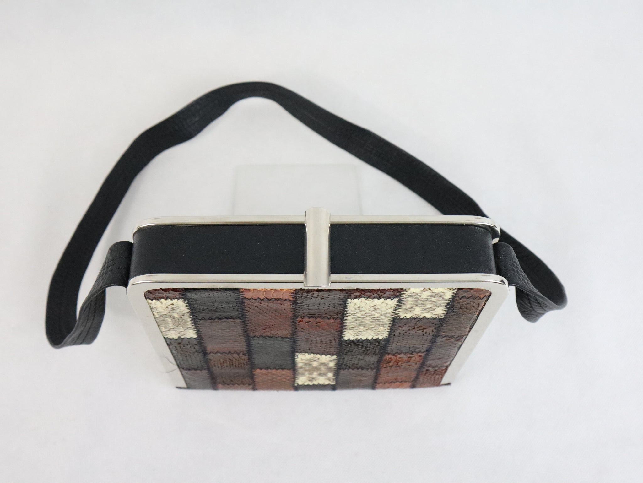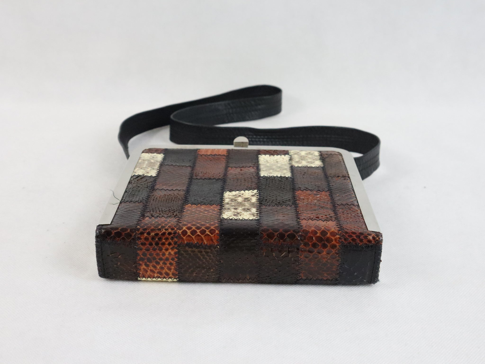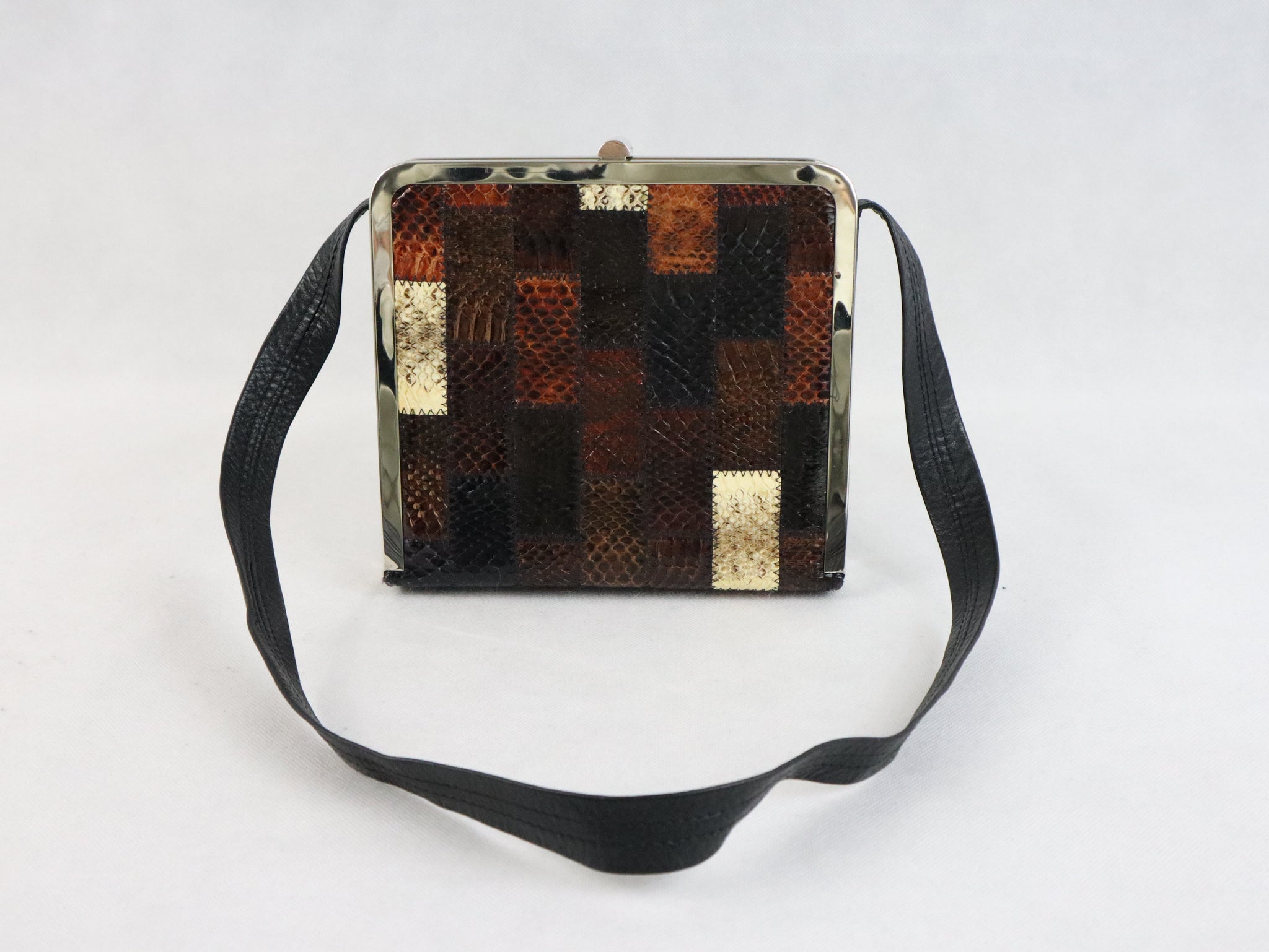 Ruskeasävyinen kotimainen 70-luvun vintage kehyslaukku, jossa on nahkapaloista sommiteltu pinta, valmistaja Three Bags of Finland, EJ-Laukku Oy, Varkaus.