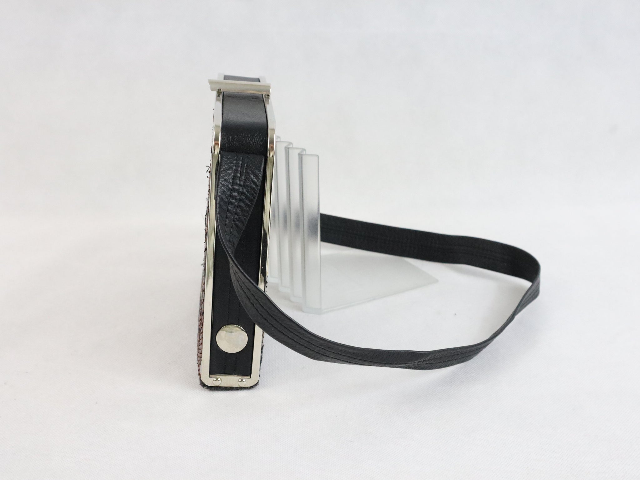 Laukussa on tukeva hopean värinen metallikehikko, joka avataan ja suljetaan metalliklipsulla. Laukun sisäpuoli on mustaa satiinikangasta ja ulkopinta on käärmeennahkaa tai jotain muuta liskomaista nahkaa. Laukun pinta on sommiteltu erivärisistä ja -kokoisista nahkapaloista.