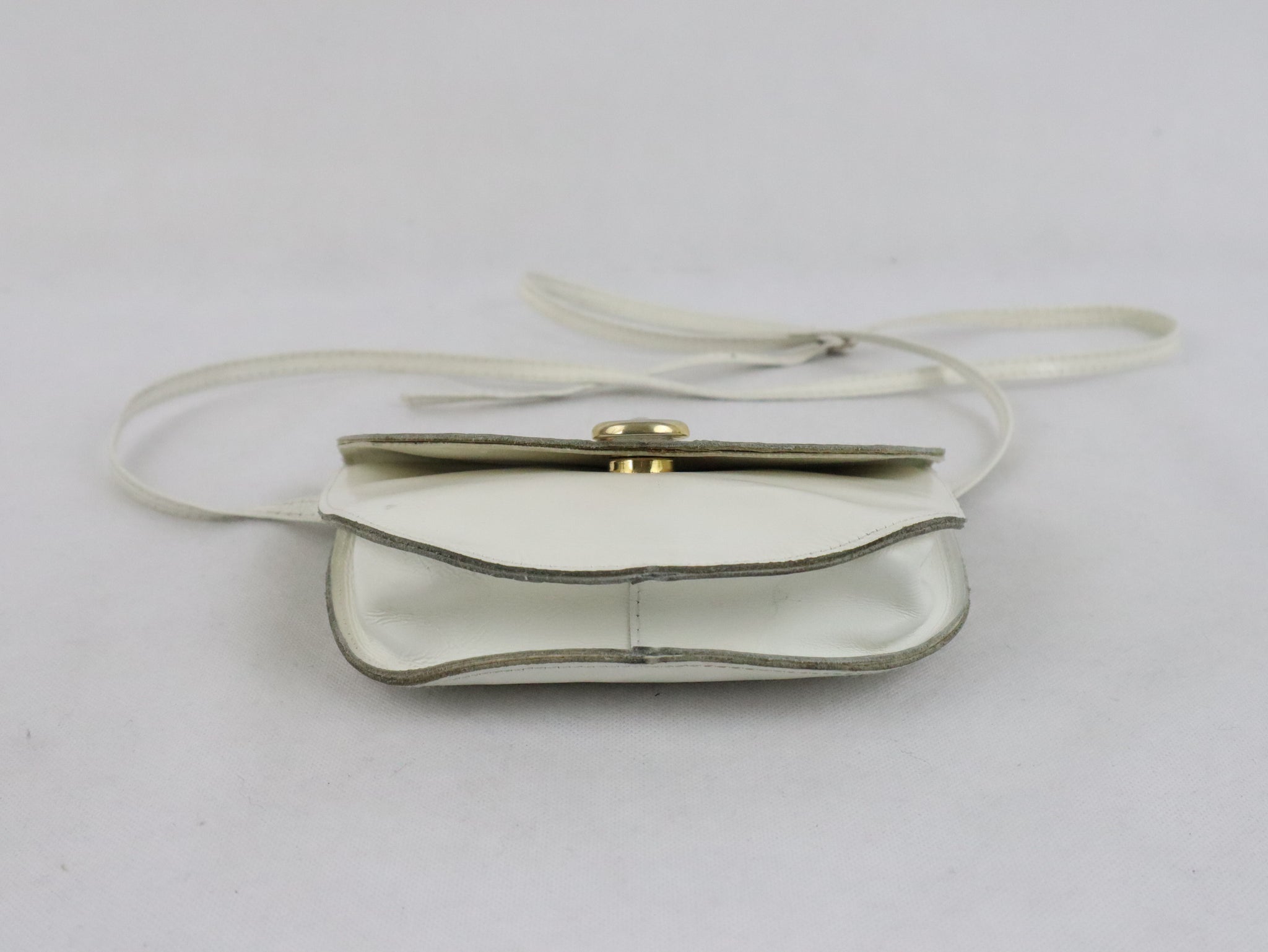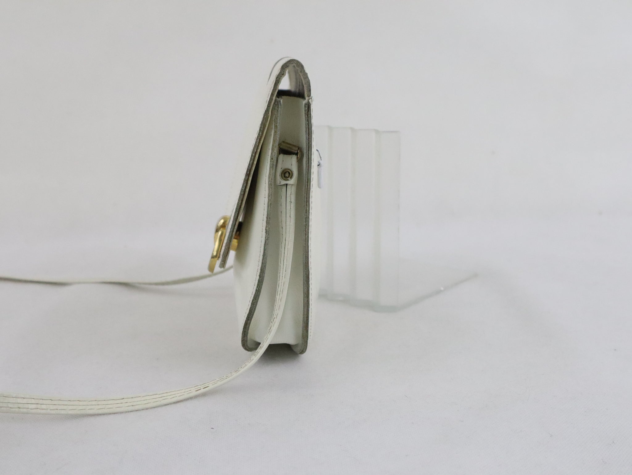 Laukun materiaali on valkoista nahkaa. Laukku suljetaan läpän alla olevalla magneettinapilla. Sisäpuolella on erillinen pikkutasku ja laukun ulkopinnassa on vetoketjullinen tasku. Laukussa on pitkä kapea olkahihna, jonka pituutta voi vapaasti säätää. Läpässä on kullanvärinen solkikoriste.