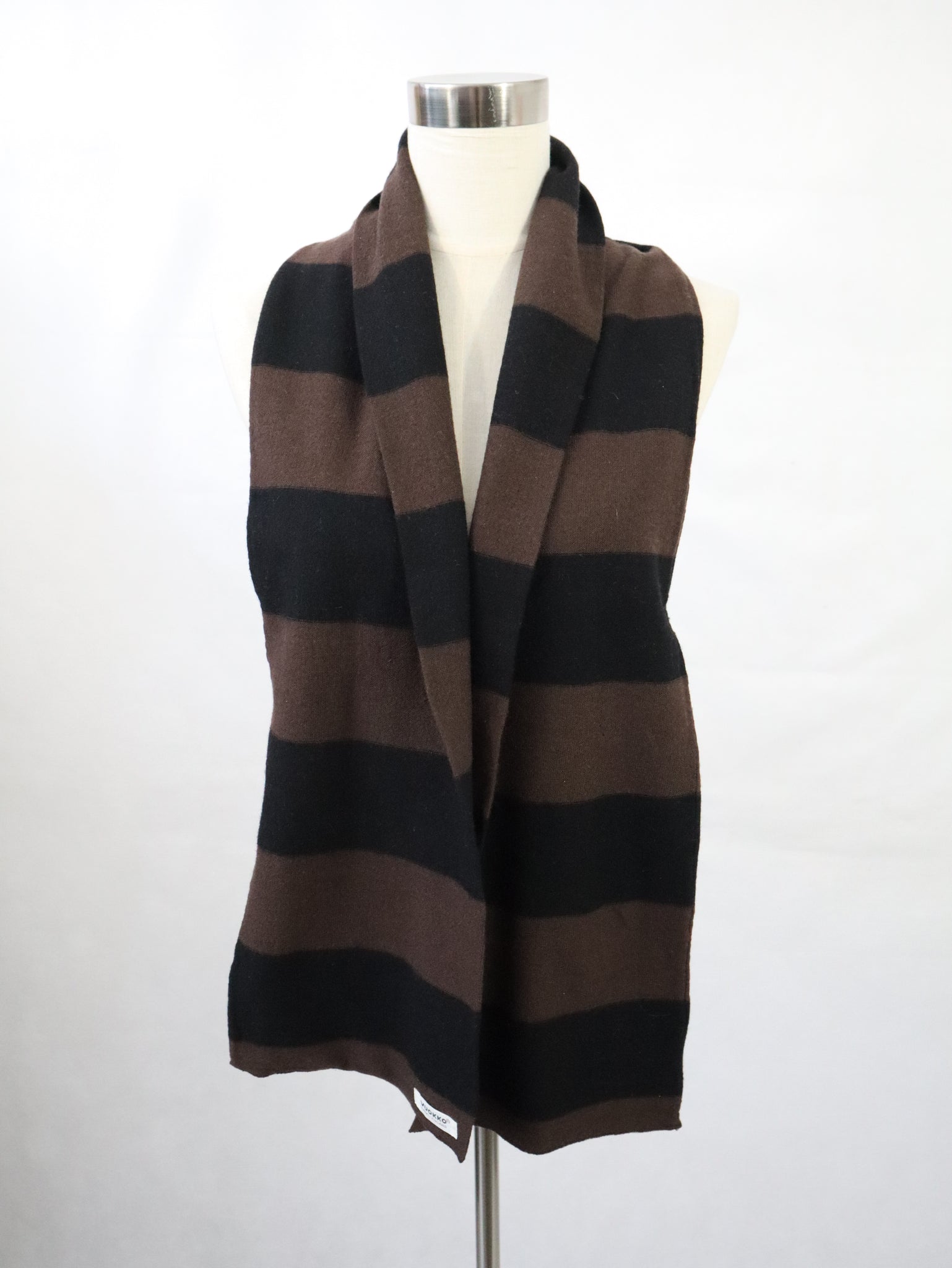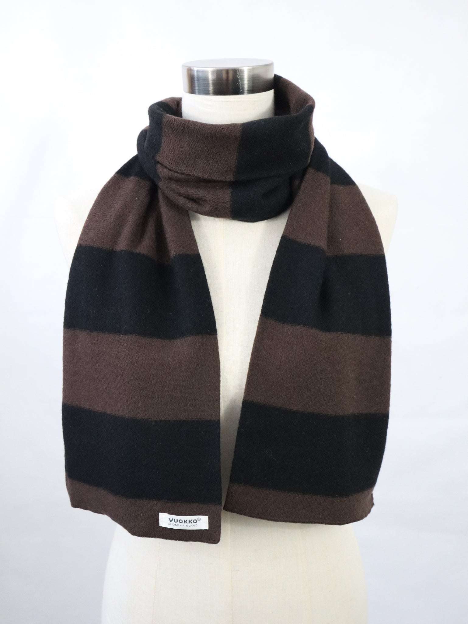 Huivi on ommeltu villaneuloksesta. Huivissa vuorottelevat mustat ja tummanruskeat raidat.