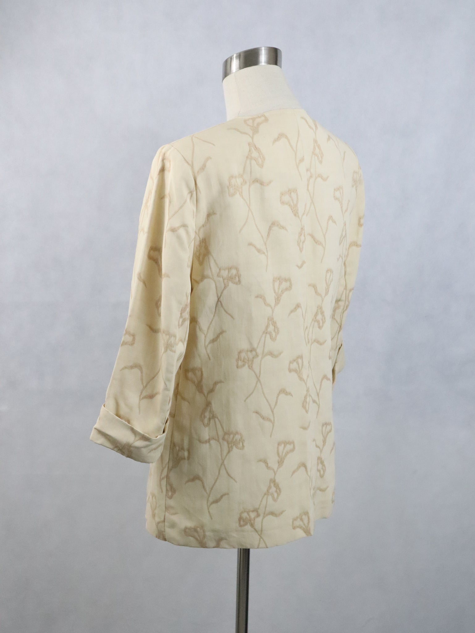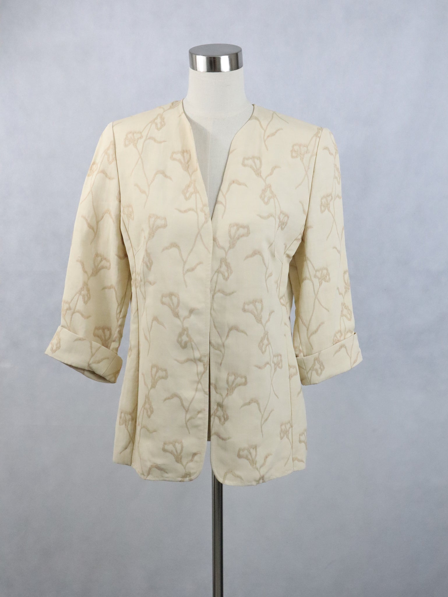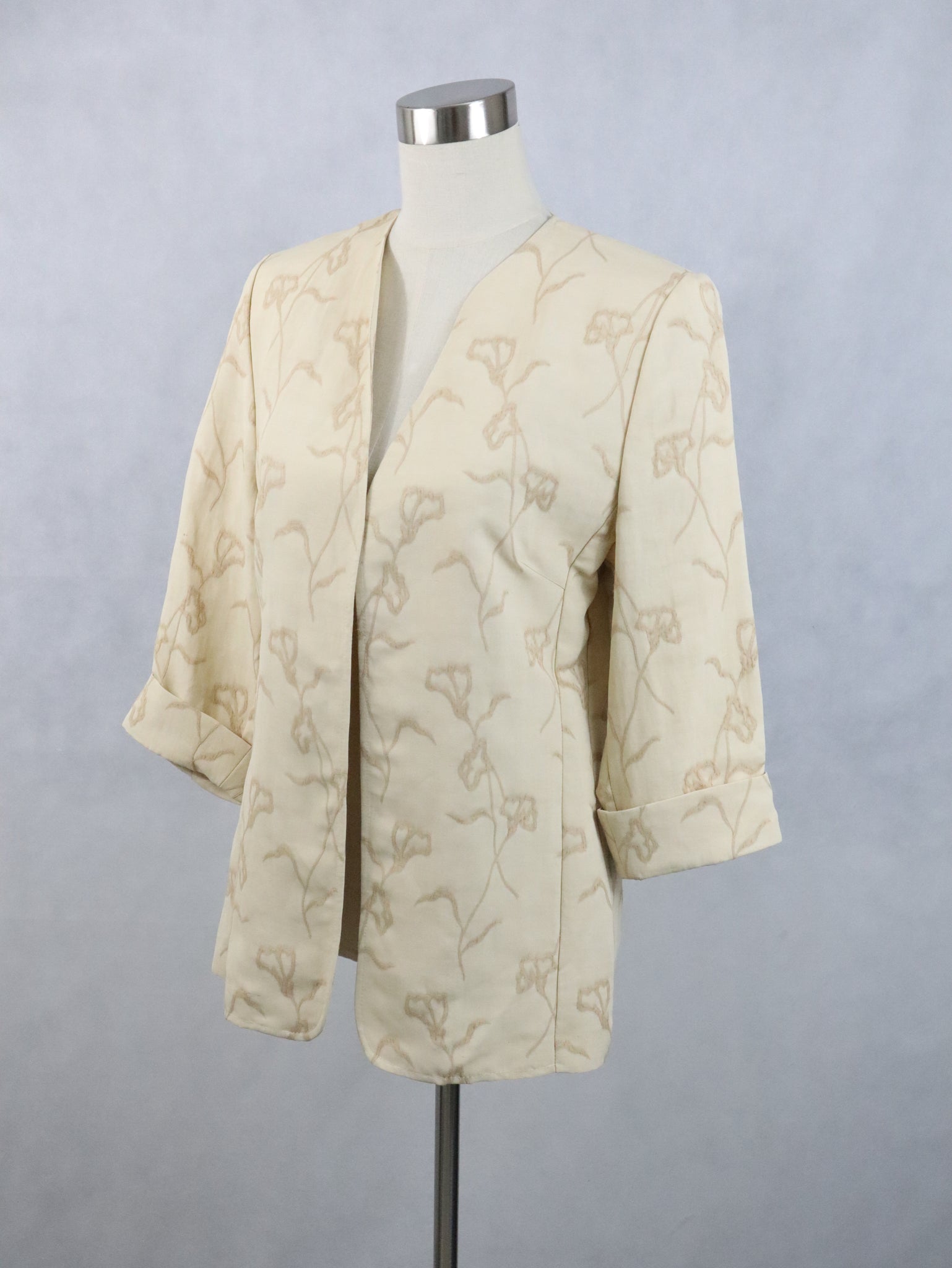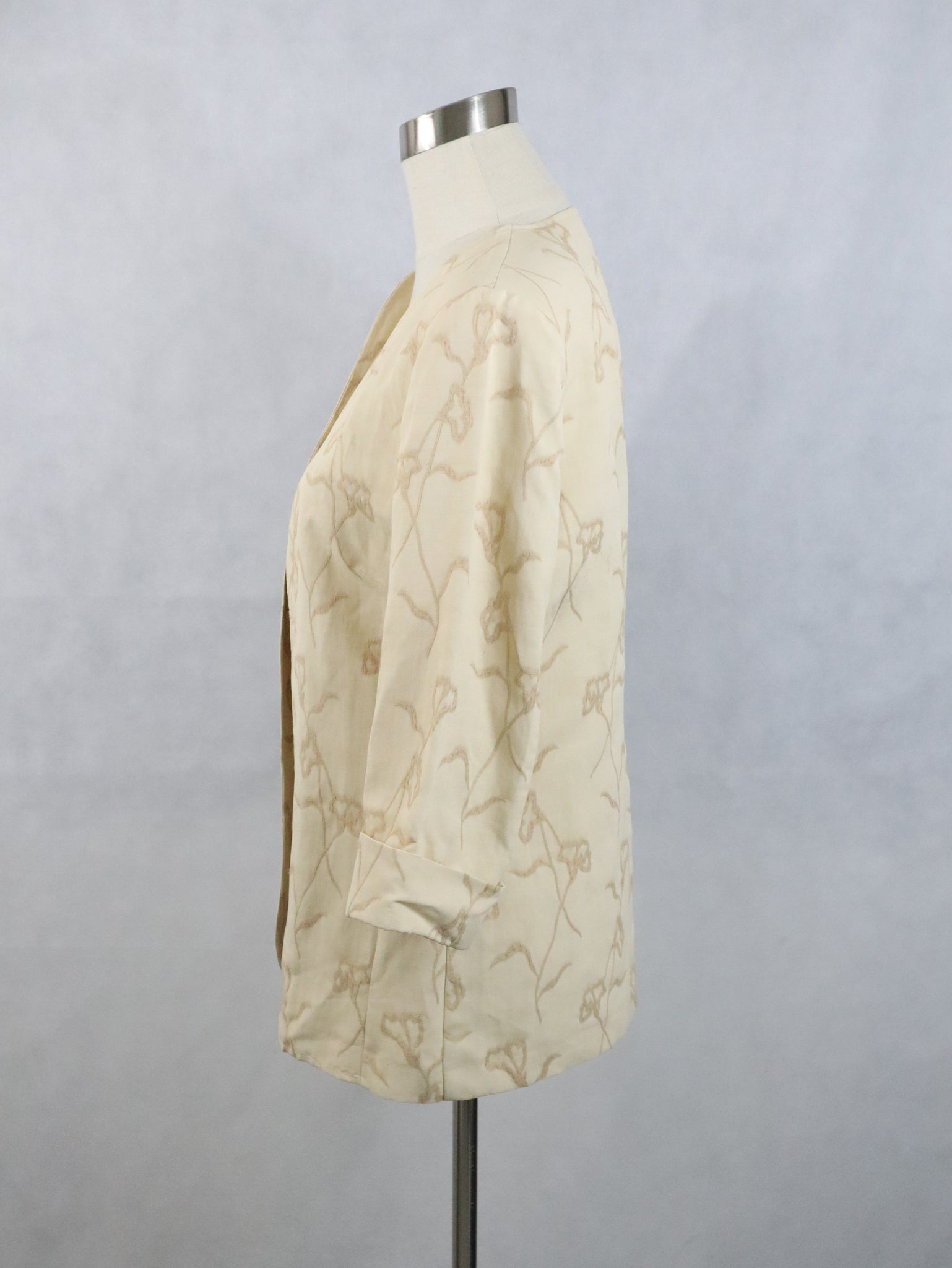Beige juhlava jakku kauniisti kirjailtua pellavasekoitekangasta, valmistaja Modelia, made in Finland.