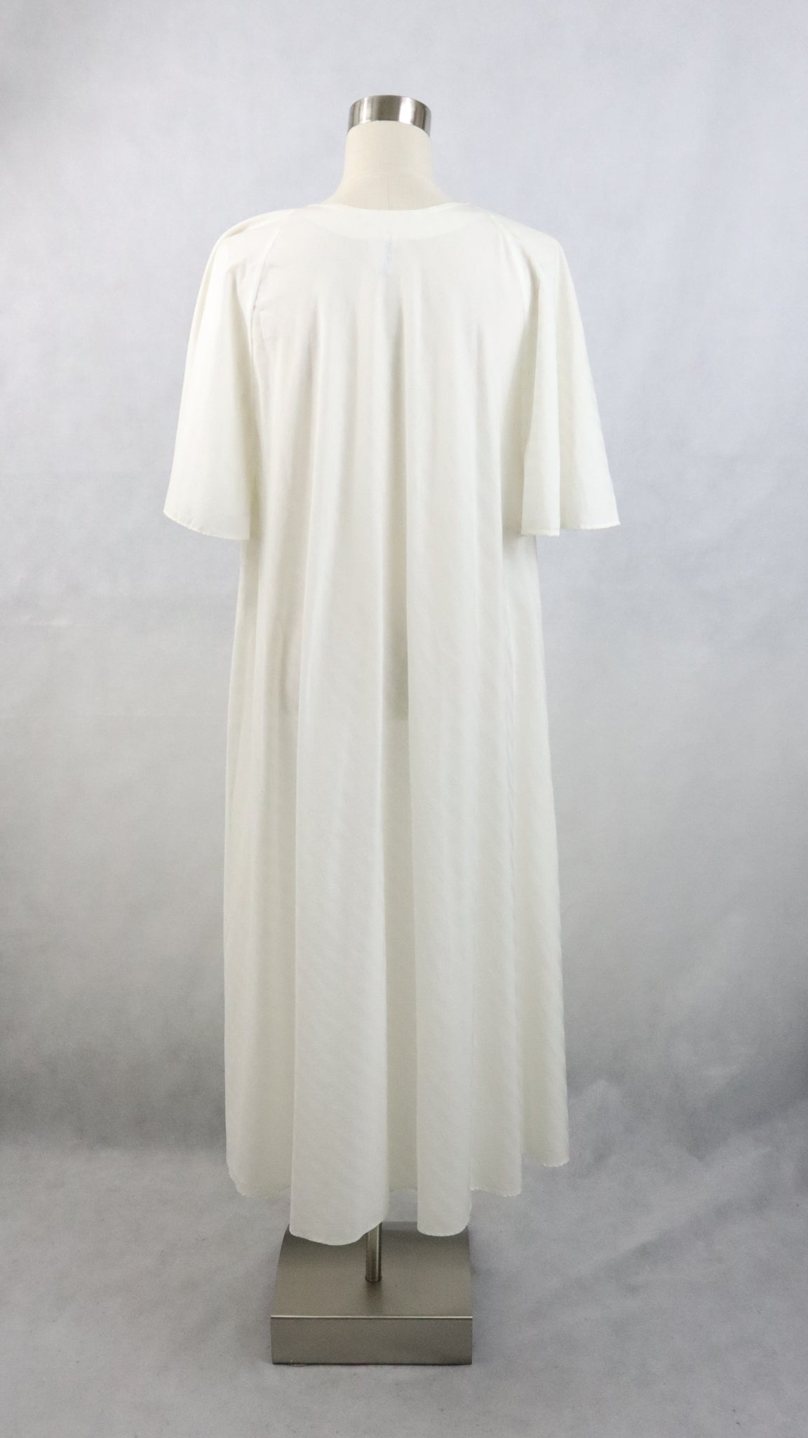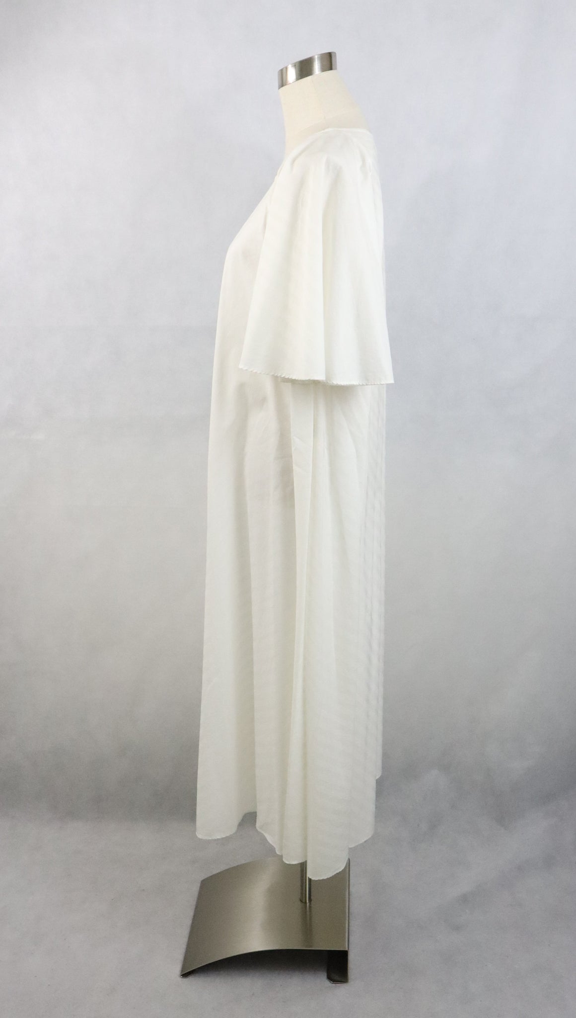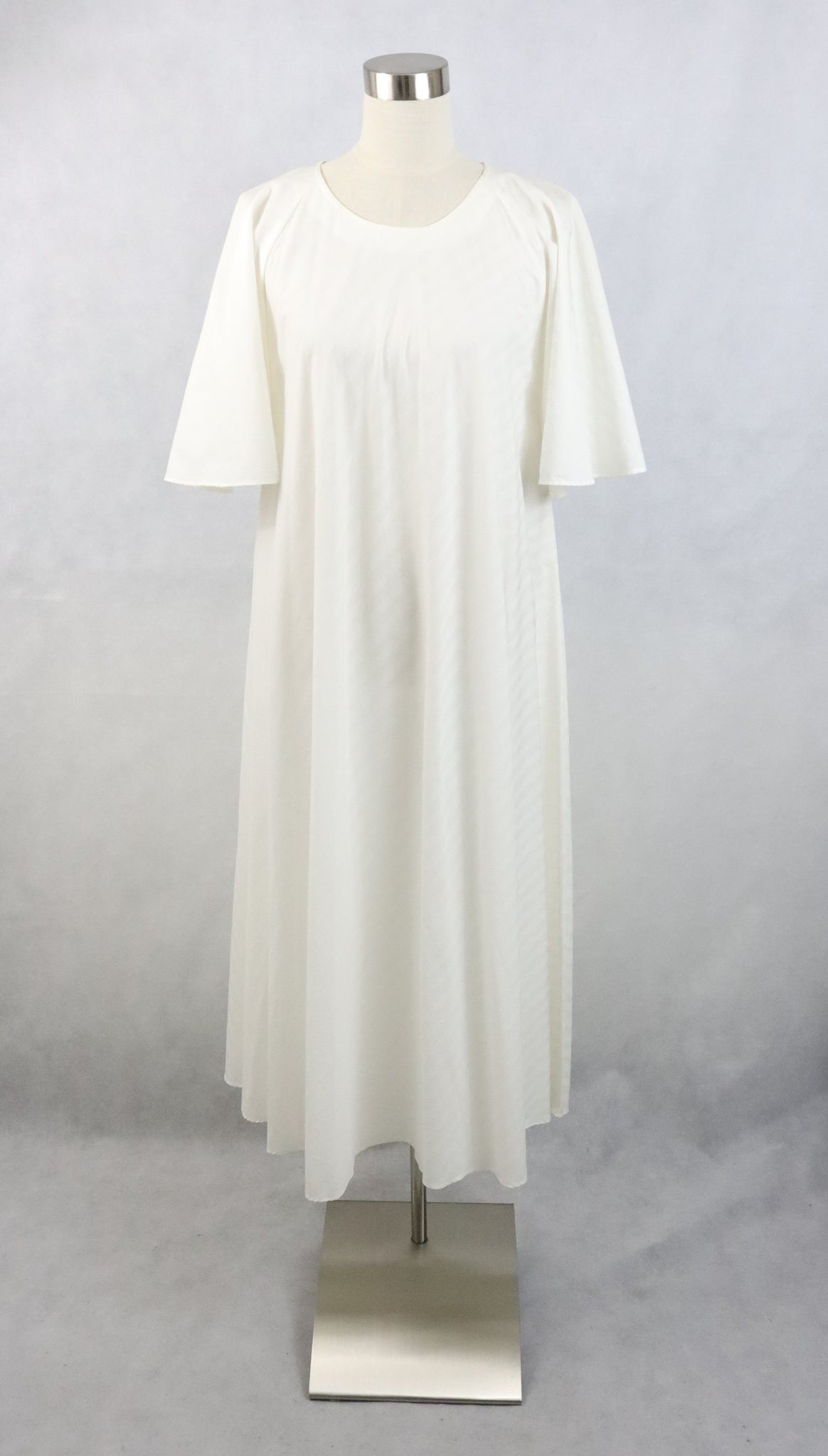 Valkoinen vuorittamaton pitkä mekko perhoshihoilla ja kellohelmalla, valmistaja Vuokko Suomi Finland.