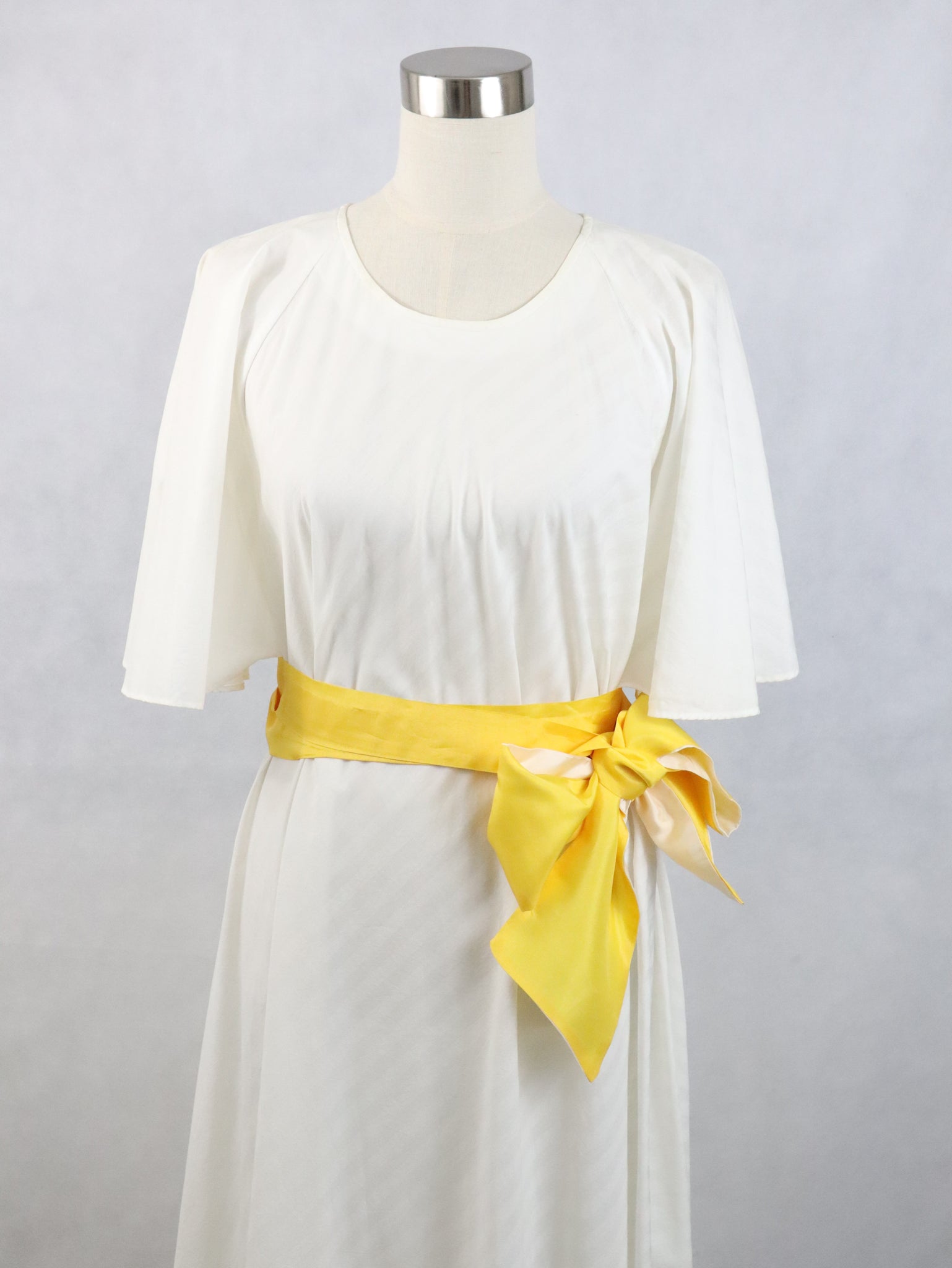 Mekossa on pyöreä kaula-aukko ja raglan-malliset leveät perhoshihat. Mekko on malliltaan a-linjainen ja levenee reilusti helmaa kohti. Mekon mukana tulee keltainen sifonkikankainen solmittava vyö.